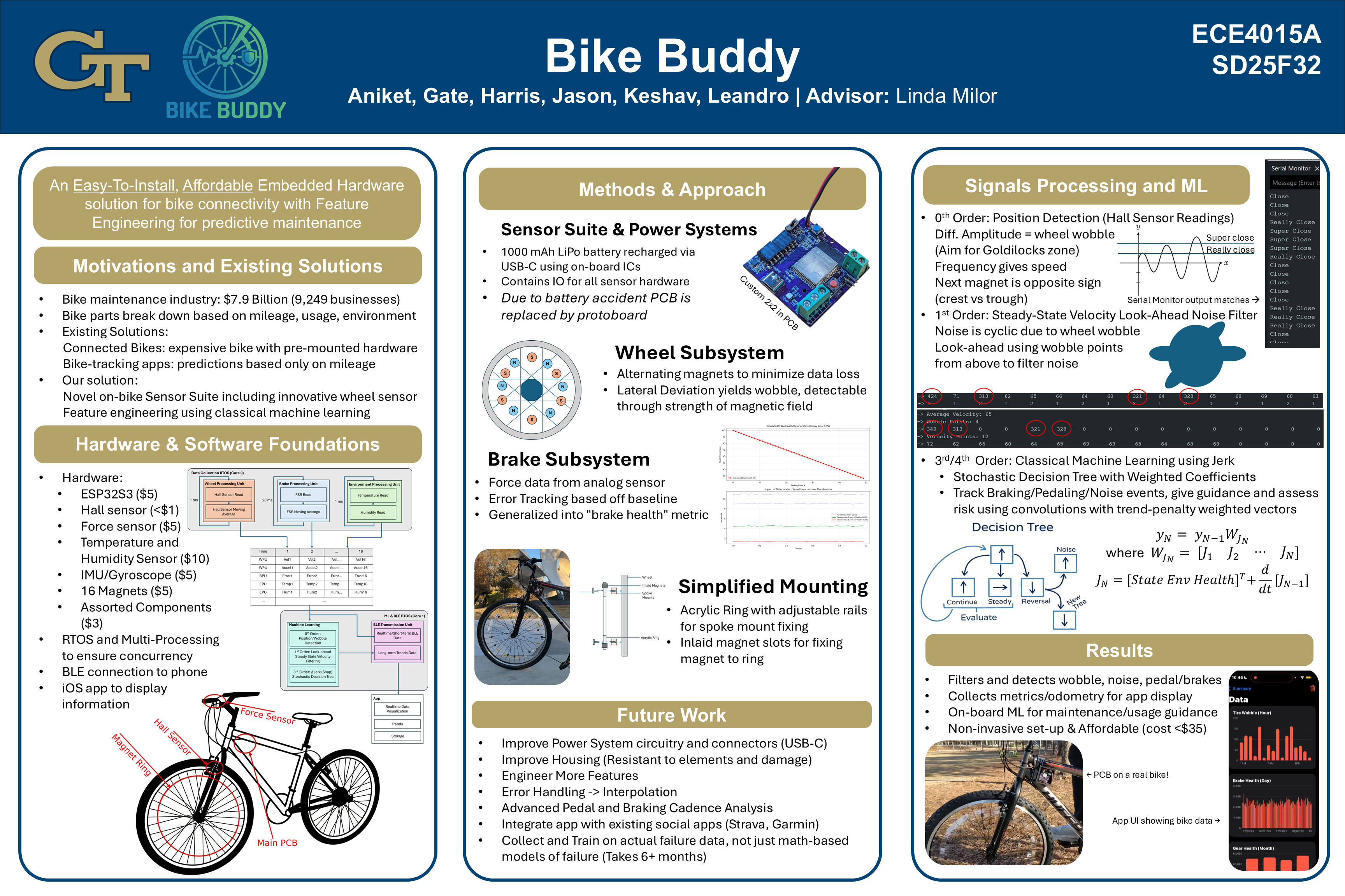 Bike Buddy is an affordable and easy-to-install embedded hardware system that enables smart connectivity to conventional bikes. Bike Buddy offers an onboard sensor suite using hall effect sensors for wheel wobble and odometry tracking, and force sensors for brake wear detection, enabling predictive maintenance.